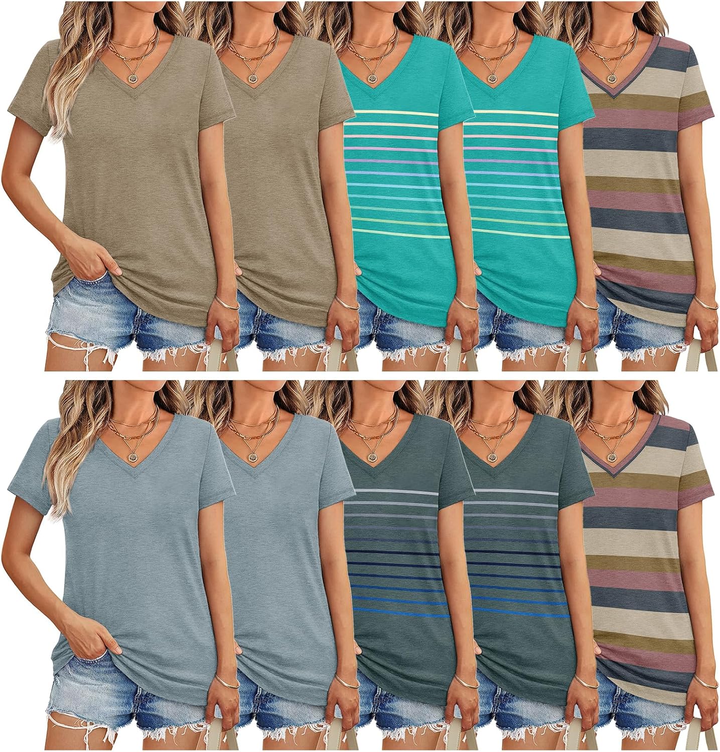 Refresh your summer wardrobe with 10 versatile V-neck tees—one for every mood. 10 Pack Women’s Short Sleeve V-Neck T-Shirts redefine casual essentials: merging soft, breathable feel with diverse designs (solid, tie-dye, trendy stripes), plus a subtle twist hem for effortless style. Product Details & Care: ☀Fabric: 95% Polyester / 5% Spandex ☀Style: 10 Pack Women’s Short Sleeve V-Neck T-Shirts ☀Fit: Classic Loose Fit ☀Care: Machine/Hand Wash Cold, Hang/Line Dry, Do Not Bleach