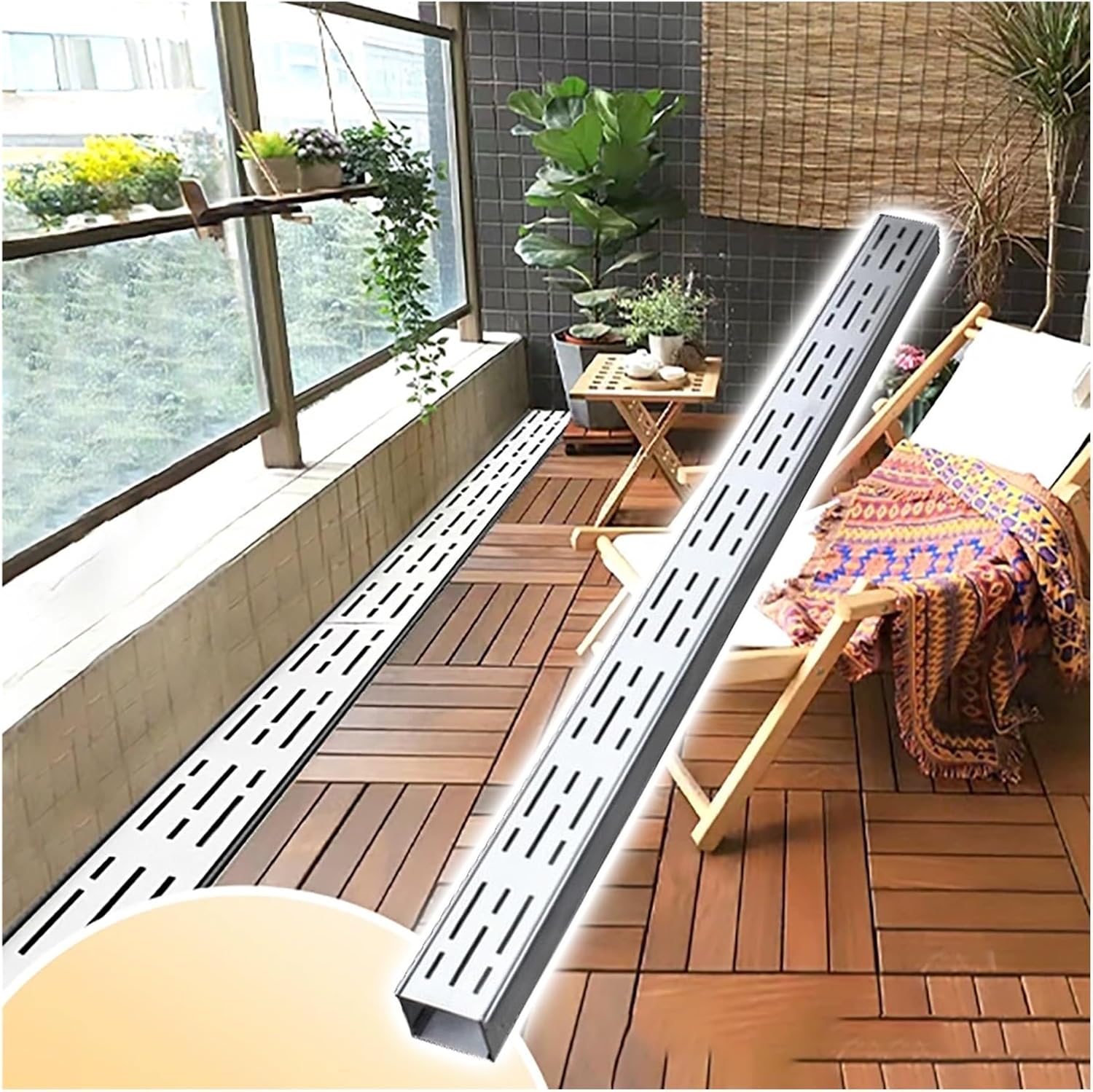 Product Description:This stainless steel channel drain system is designed to effectively manage rainfall runoff and prevent standing water in various environments. Ideal for residential areas, gardens, patios, and driveways, this versatile drainage solution helps protect your property from water damage and enhances outdoor usability.Specifications:- Material: Stainless Steel- Length: 1m (39.4in)- Thickness: 1mm- Size: Width x Height*Note: We offer a variety of elbow connectors to meet your installation needs. Please inquire after placing your order.*Features:- Sturdy Lay-Flat Design: Increases stability, ensuring your drainage system remains securely in place during heavy rainfall.- Quick Assembly: Designed for easy installation, making it suitable for both DIY enthusiasts and professionals alike.- Efficient Water Channeling: Perfect for areas prone to water accumulation, effectively redirecting rainfall and preventing puddles. - Hollow Design: Allows for rapid water discharge without blockages, keeping your drainage system functional and reliable.- Durable Construction: With strong load-bearing capabilities, this drain is built to withstand various environmental conditions.- Narrow Hole Design: Prevents leaves and debris from clogging while facilitating fast drainage.- Versatile Applications: Suitable for indoor and outdoor use, including gardens, lawns, garages, sports courts, and more.Package Includes:- 1 x Channel Drain SystemNotice:1. Please allow a 1-3cm error in size due to manual measurement.2. Colors may slightly vary due to lighting and screen settings.Experience the benefits of efficient drainage with our stainless steel channel drain, perfect for maintaining a clean and safe environment around your home.