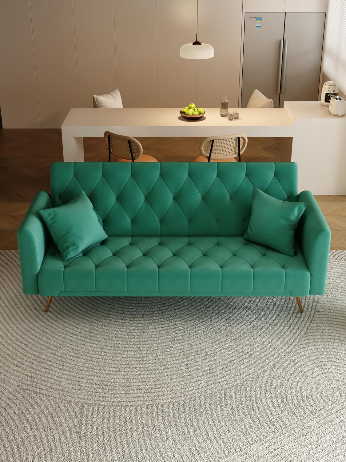 Elevate your home environment with this sophisticated and versatile furniture piece designed for modern living. This multi-functional sofa bed makes the living environment in a compact studio or apartment feel more casual and inviting by offering a seamless transition from a stylish seating area to a comfortable sleeping surface. The adjustable backrest features three distinct positions, allowing you to recline at a 135° angle for reading or watching TV, or flatten it to 180° for an impromptu guest bed. Crafted with premium velvet fabric and supported by five gleaming golden metal legs, this velvet futon combines aesthetic appeal with structural integrity. Whether you are furnishing a dorm room, a small office, or a cozy living room, this space-saving couch provides the perfect balance of comfort and utility. The inclusion of two matching toss pillows ensures added support, while the high-density foam filling offers a plush experience for sitting or lounging throughout the day. Assembly is exceptionally straightforward, requiring no specialized tools, and the durable solid wood frame guarantees that this stylish sleeper will remain a reliable part of your interior decor for years to come. Weights & Dimensions: Overall - Sofa: 71 x 19 x 30 inches Sofa Bed: 71 x 38 x 24 inches Seat Height: 30 inches Product Weight: 58.4 LBS Gross Weight: 61.75 LBS Carton Size: 66.22 * 39.19 * 6.84 inches Product Type: Sofa Bed Seating Capacity: 2 Upholstery Material: Velvet Leg Material / Color: Golden Seat Fill Material: Foam Back Fill Material: Foam Frame Material: Solid + Manufactured Wood Seat Construction: Solid Wood + Serpentine Spring Pillows Included: Yes (2 Toss Pillows) Removable Cushion Cover: No Weight Capacity: 600 LBS Product Care: Wipe clean with a dry cloth