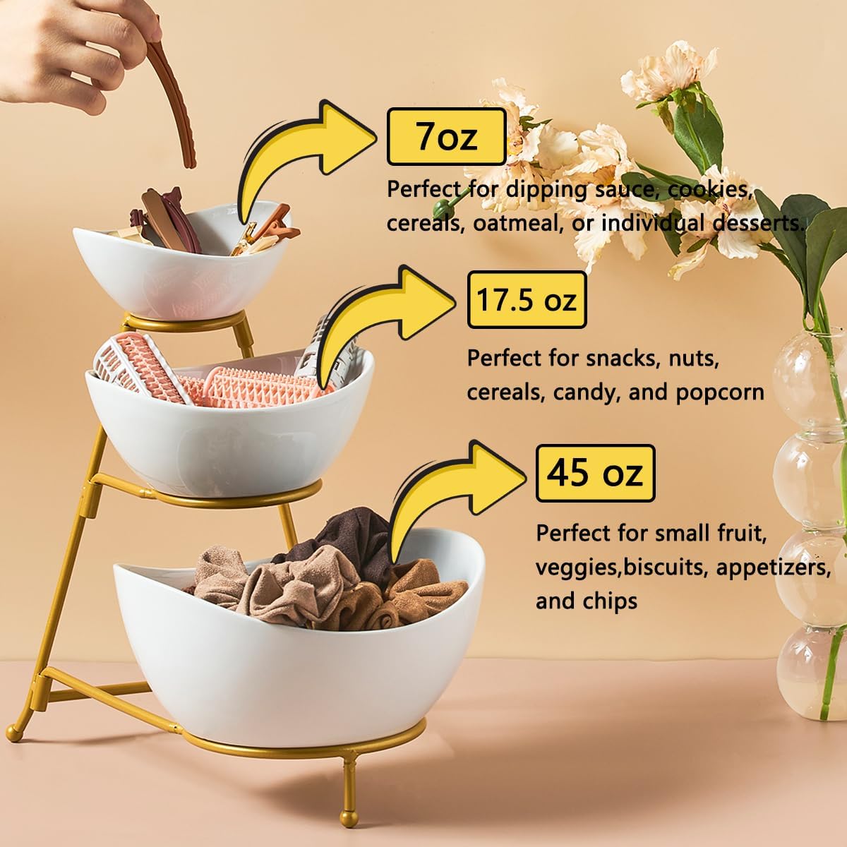 Asian Soup Spoon, Chinese Spoons, Ramen Spoons, Japanese Ceramic Spoon Set of 6,Thanksgiving Christmas Kitchen With Long Handle for Serving, Ramen, Pho, Noodles, Green and 3 Tier Serving Bowls Set Tiered Serving Stand, Porcelain Oval Bowls with Collapsible Metal Stand for Entertaining, Party, Dessert Display, Candy, Chip and Dip (Gold)-45oz / 17.5oz / 7oz