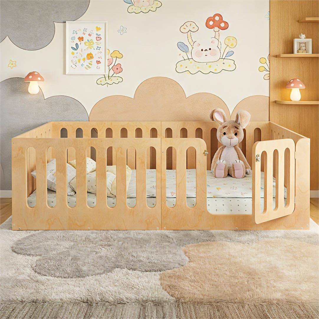 Bellemave Montessori Twin Floor Bed Frame with Fence and Removable Door, Low Profile Twin Size Montessori Bed Frame for Kids, Solid Wooden Floor Beds with Slats for Bedroom,Nursery, White