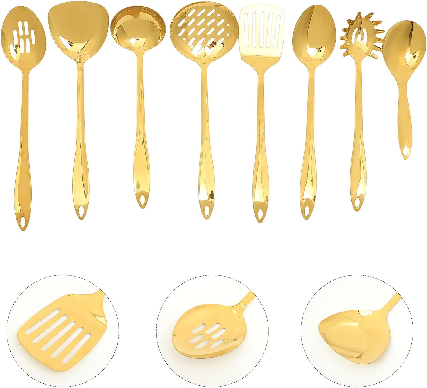 Package Include 1 x Rice Scoop 1 x Slotted Turner 1 x Soup Spoon 1 x Noodle Spoon 2 x Slotted Spoons 1 x Turner 1 x Spoon Characteristics -Size slotted spoon 2: 36x11.5cm/14.17x4.53in metal utensils -Size rice scoop: 9x7.2cm/ 3.54x2.83in metal cooking utensils. -Material:Stainless steel kitchen utensils -Size soup spoon: 31x9cm12.20x3.54in kitchen utensil -Size turner: 35x9.7cm/ 13.78x3.82in stainless steel kitchen utensils -Size slotted spoon: 7.2x35.5cm/2.83x13.98in stainless cooking utensil -Size slotted turner: 36.5x7.7/ 14.37x3.03in restaurant cooking tools -Color:Golden stainless steel utensils for cooking -Product Info:Kitchenware set -Size spoon: 36x7cm/14.17x2.76 stainless cooking utensils -Size noodle spoon: 7.4x32cm2.91x12.60in cooking utensils stainless steel -The combination and collocation of multiple tools can better meet the needs stainless steel kitchen tools. -Smooth surface and portable size, they can help you to cook some delicious dishes stainless steel utensils. -They have comfortable handle, , easy to stir and do not hurt the pot stainless steel kitchenware.Goods Informationkitchen utensils stainless steel Perfect for non-sticky pans to cook delicious food.kitchen utensil These kitchen tools are more than similar products in the market to offer you more convenience when cooking.metal cooking utensils Made of premium stainless steel, the kitchen utensils are and to use.metal utensils for cooking Stylish kitchen utensils help create tasty dishes for your friends and family