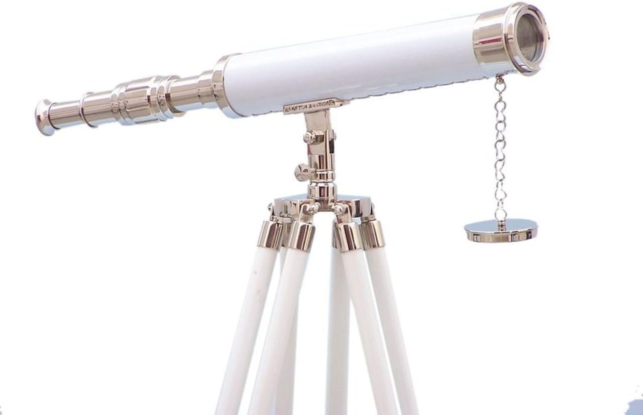 The Hampton nautical floor standing bronzed Harbor master telescope 60 inches a beautiful bronzed refractor telescope mounted on a wooden tripod. This telescope is a fully functioning nautical masterpiece that adds class and sophistication to any room it's in. This is a perfect gift for the nautical Explorer. The main scope is bronzed with a smooth polished finish. Focusing is accomplished by adjusting the eyepiece ring on the telescope tube, with up to 15x magnification. A removable bronzed cap, connected by a chain, protects the objective lens.--The wooden tripod stand features smooth, polished round legs, each with bronzed fittings and a screw release to let you adjust the height. A bronzed chain holds the three wooden legs together so the telescope can maintain its position.