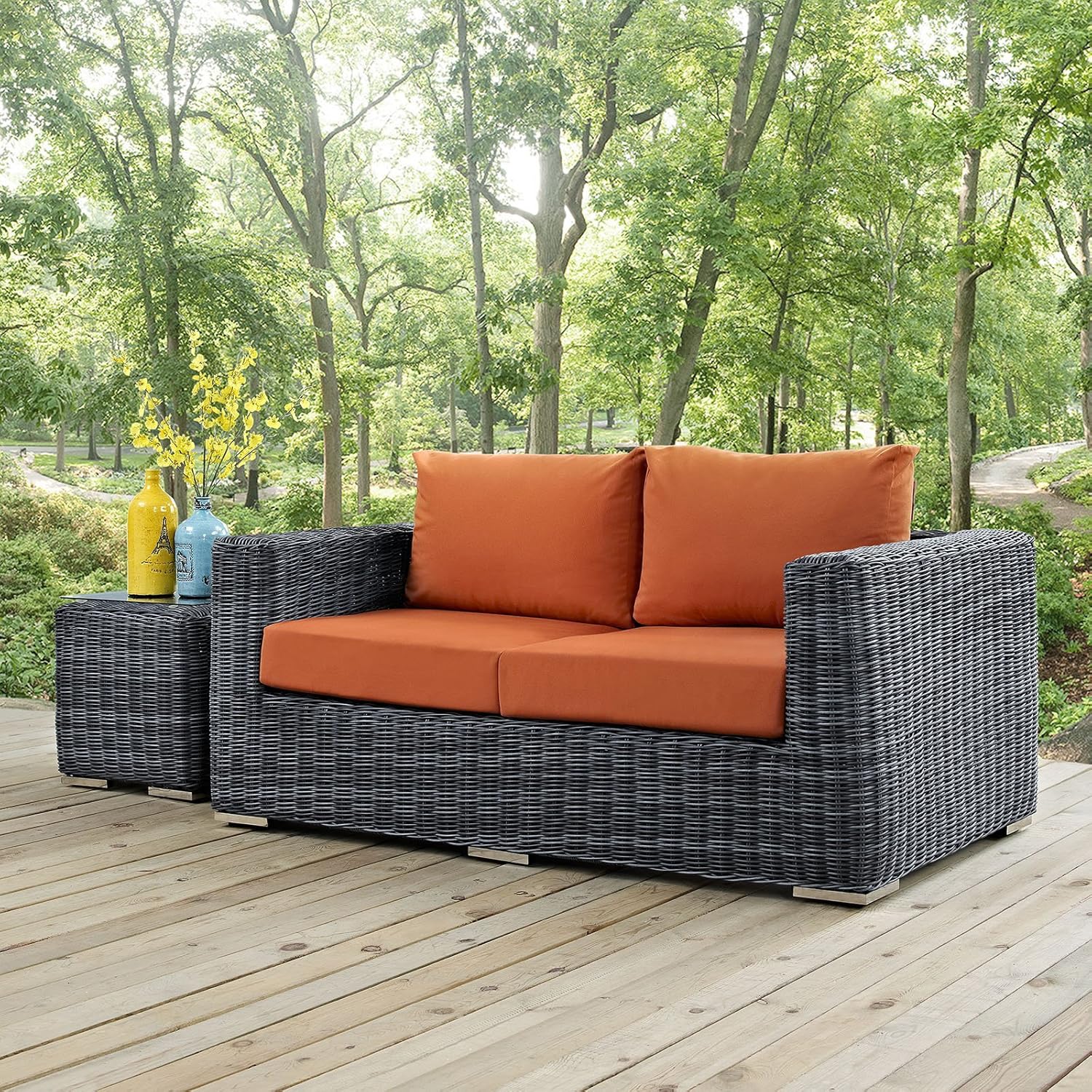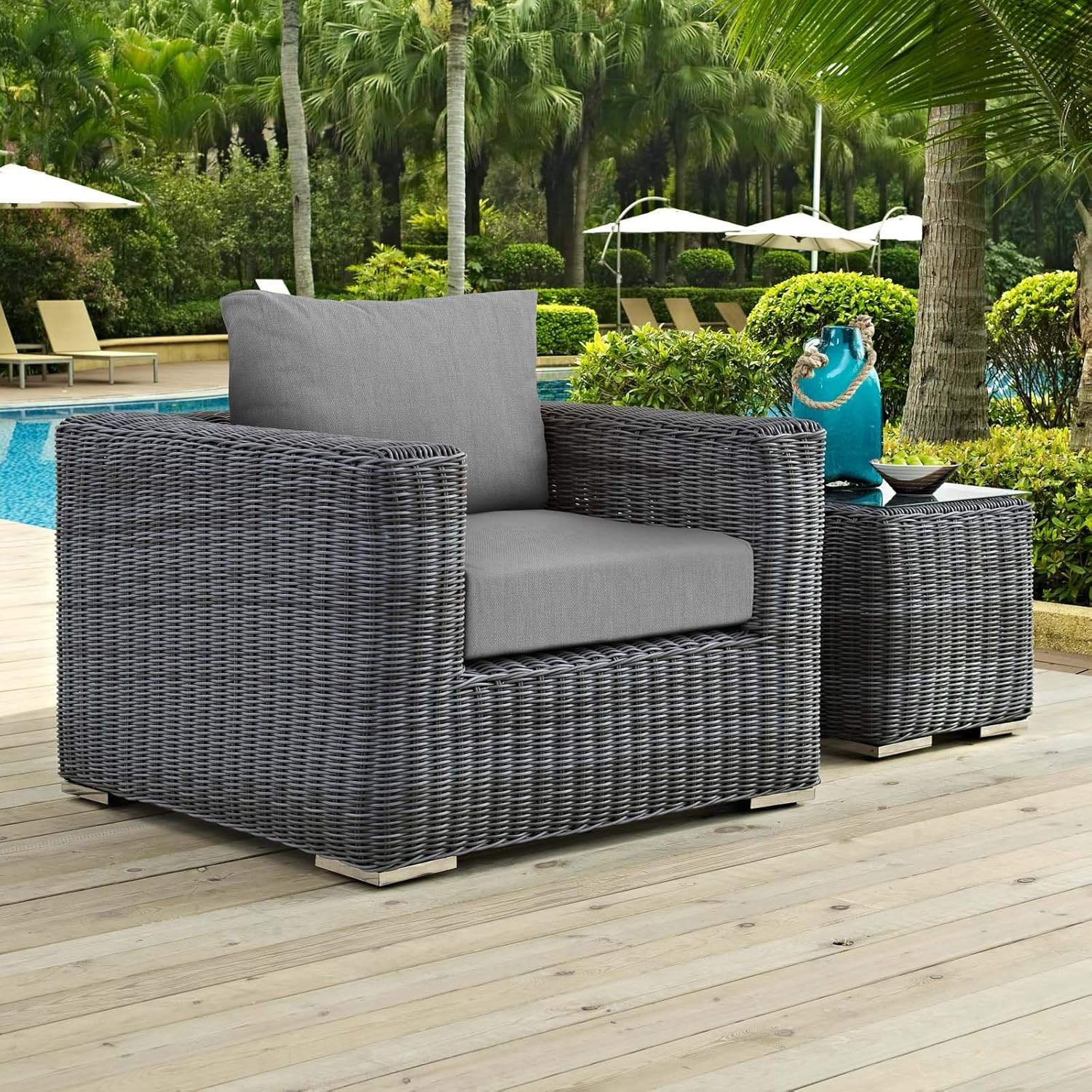 | Material Features | Two-tone synthetic rattan weave, UV & water-resistant plush all-weather cushions, and sturdy powder-coated aluminum frame |
