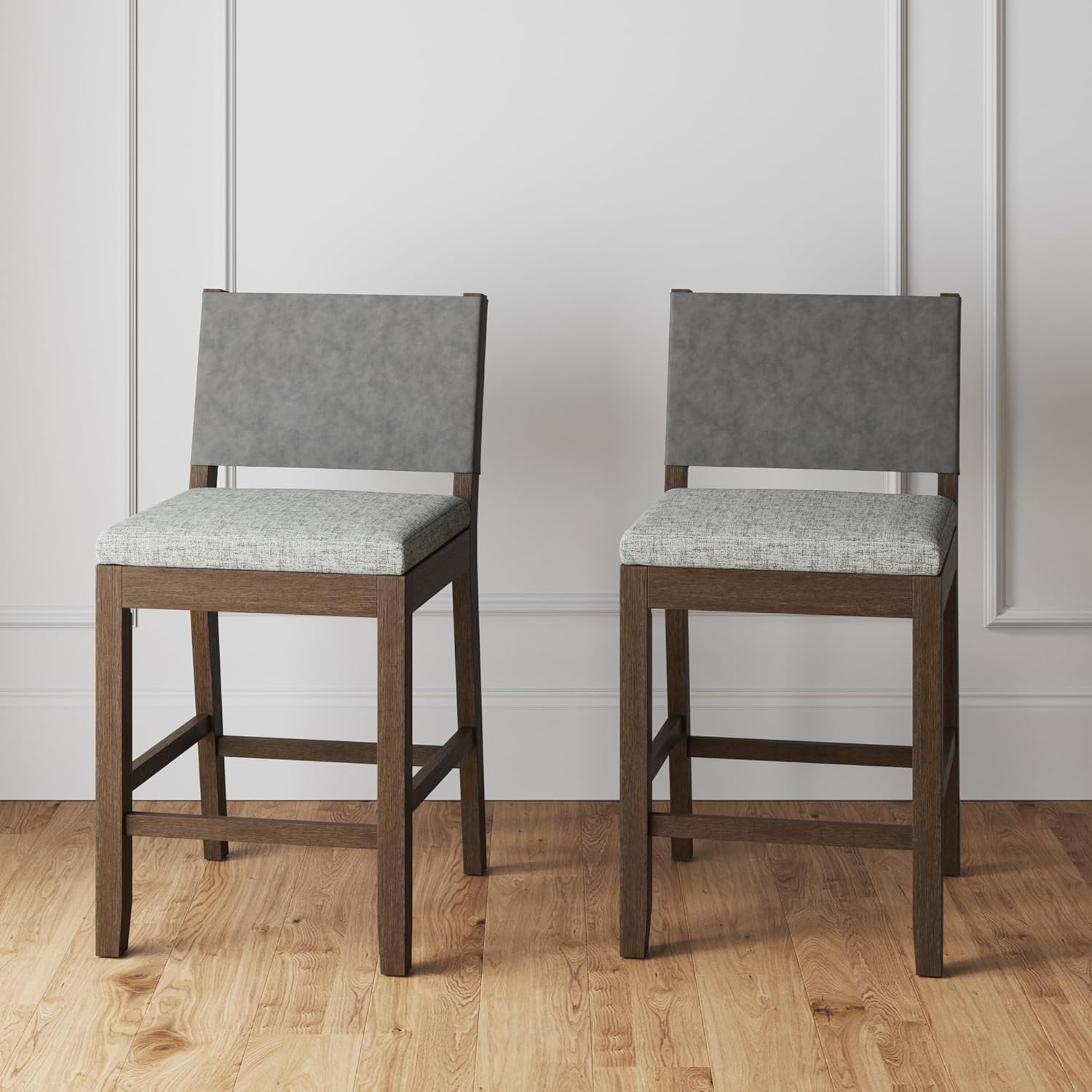 The Linus solid wood modern counter height bar chair has got your back (literally) covered. The bar stool has a thick, durable cushion upholstered in a charming natural flax material. The wire-brushed light brown counter stool is crafted with sturdy rubberwood legs and holds up to 300 pounds, plenty for holding you and that extra glass of wine after work. It has a built-in footrest so you can enjoy each snack in complete comfort. This timeless counter stool will seamlessly blend in with your modern farmhouse home, and the best part: it takes only 15 minutes to assemble! Nathan James is the furniture company built for this generation. You don't need to spend a fortune to get quality design-first furniture, and when we say easy assembly, we mean it. Our guarantee is our word. Your purchase is backed by a 100% money-back guarantee. If you have any quality issues, contact us, and we will send you a replacement immediately—no questions asked. This product is not recommended for commercial use. Materials: - Rubberwood legs - Natural Flax polyester Fabric cushion Assembly Must-Haves: -Scissors Weight Limit: - 300 lbs Nathan James is the furniture company built for this generation. You don't need to spend a fortune to get quality design-first furniture, and when we say easy assembly, we mean it. Our guarantee is our word. Your purchase is backed by a 100% money-back guarantee. If you have any quality issues, contact us, and we will send you a replacement immediately—no questions asked. This product is not recommended for commercial use. Materials: - Rubberwood legs - Natural Flax polyester Fabric cushion Assembly Must-Haves: -Scissors Weight Limit: - 300 lbs