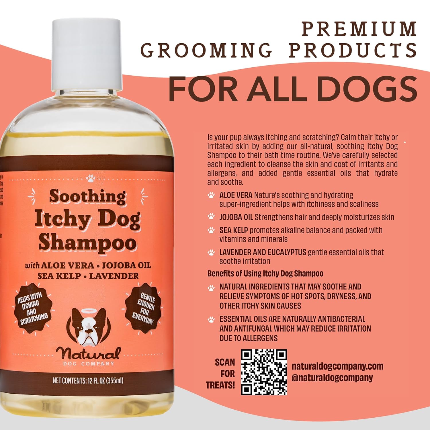 Indulge your pup with a luxurious bath using our all-natural dog shampoo. Formulated with a unique blend of jojoba oil, aloe vera, lavender oil, and eucalyptus oil, this shampoo provides relief from allergies, itching, smelly dogs, de-shedding, dandruff, and dry skin irritation. Safe for puppies 8 weeks and older, as well as other pets, our shampoo leaves coats soft, smooth, and shiny. Say goodbye to itch relief products and stubborn pet dander as our shampoo soothes itchy skin and replenishes essential oils, keeping your pup's coat beautiful longer. For quick, in-between bath refreshment, our Itchy Dog Spritz is your go-to solution. Specifically designed for dogs with itchy skin, this deodorizing spray keeps your pooch smelling fresh and clean. With ingredients like aloe vera, lavender, eucalyptus oils, and calendula extract, this spritz not only masks odors but also hydrates dry skin, soothes skin irritation, and provides additional care for a soft, shiny coat.
