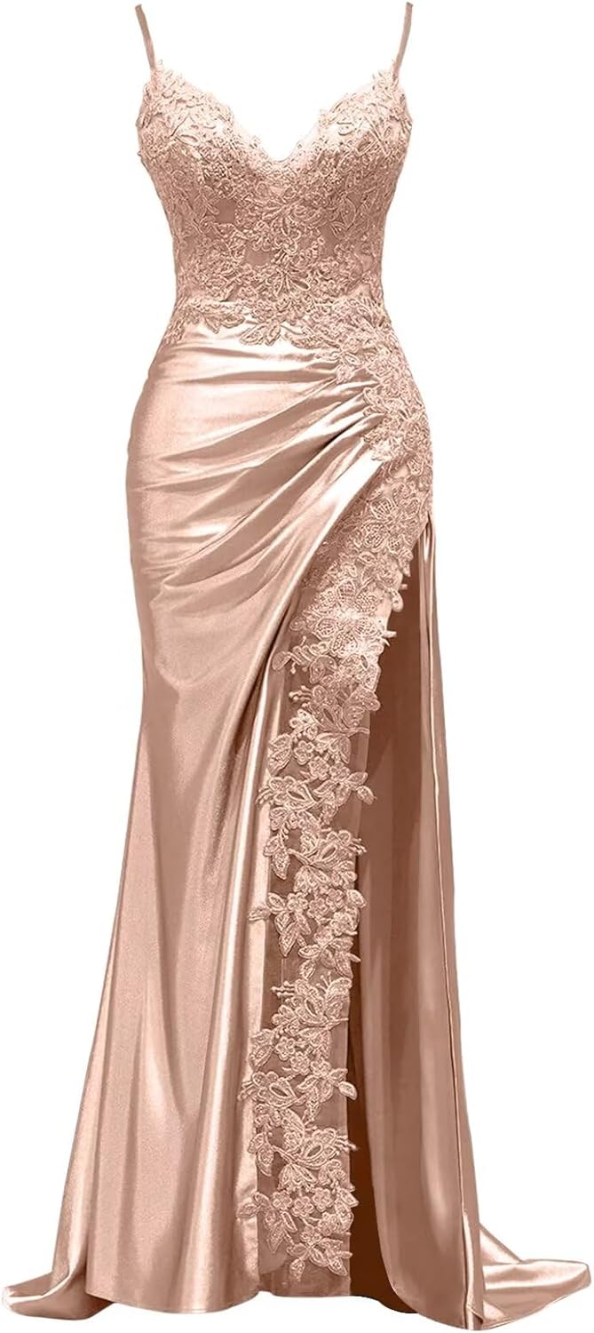 Satin Prom Dresses with Sllit Mermaid Spaghetti Straps Lace Appliques Long Mermaid Formal Evening Gowns for Women