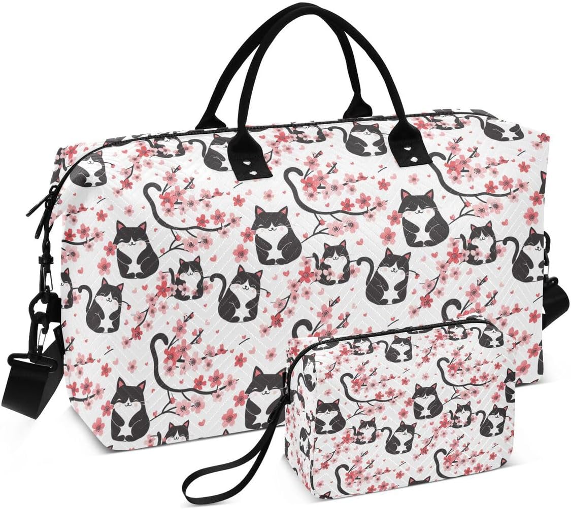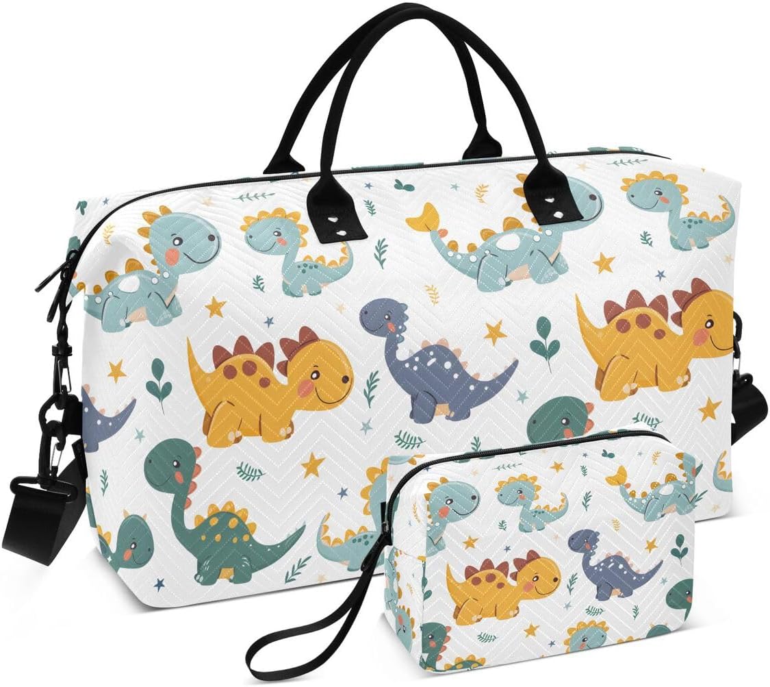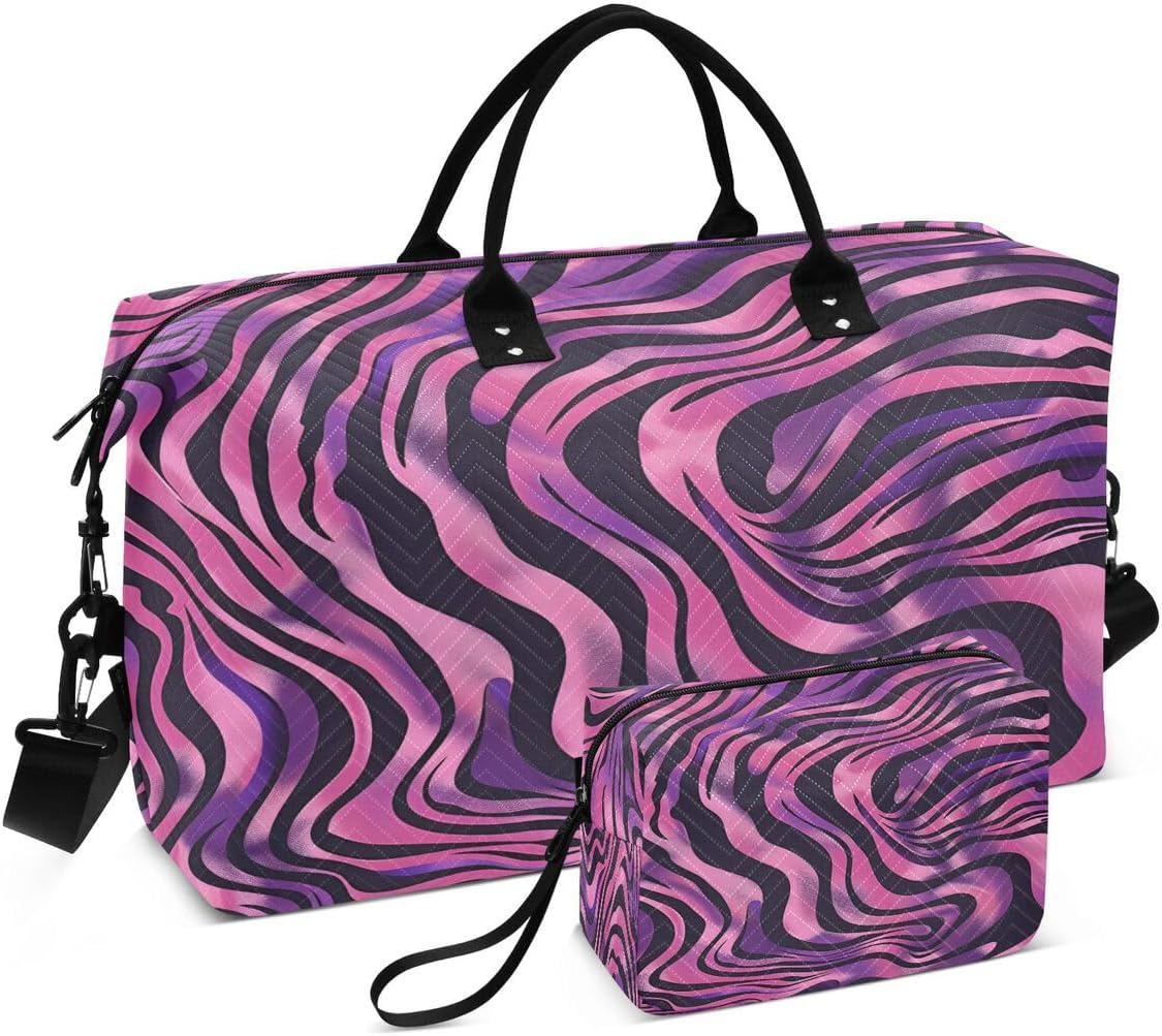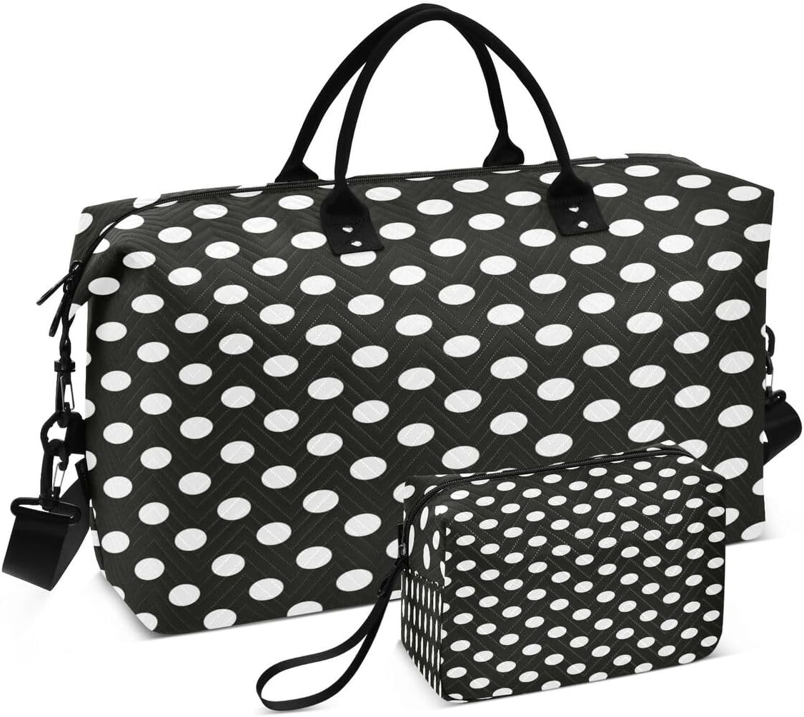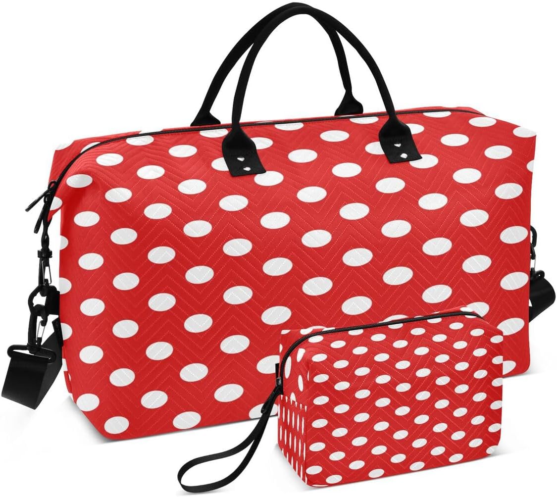 Travel Duffle Bag:Material: Made of 100% polyesterNet Weight: 0.65kg.Dimensions: The travel bag: 20.5 x 7.9 x 13.8 inches, the toiletry bag: 9.1 x 5.9 x 3.5 inchesCapacity:Roomy enough for everyday items while not too big for awkward carry.Design: 1 main compartment, several inner pocket, 2 Large mesh bag, 1 interior pocket, large and roomy enough to organize your clothes and essentials.Usage:It's suitable for gym, sport, yoga, dance, travel, carry-on, luggage, camping, hiking, team work, training and more.The weekender duffle bag equipped with back sleeves to keep it in place on main roller suitcase.
