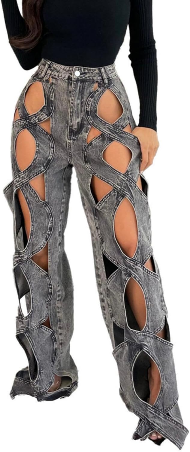 Womens Casual Straight Leg High Rise Cutout Metal Buttoned Jeans Denim Pants