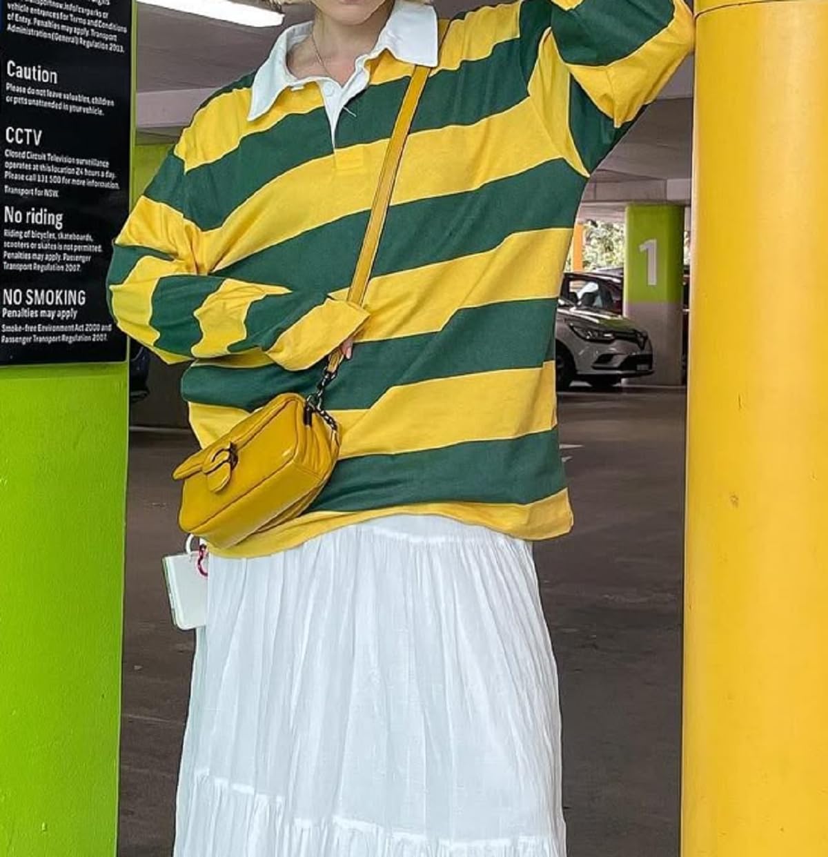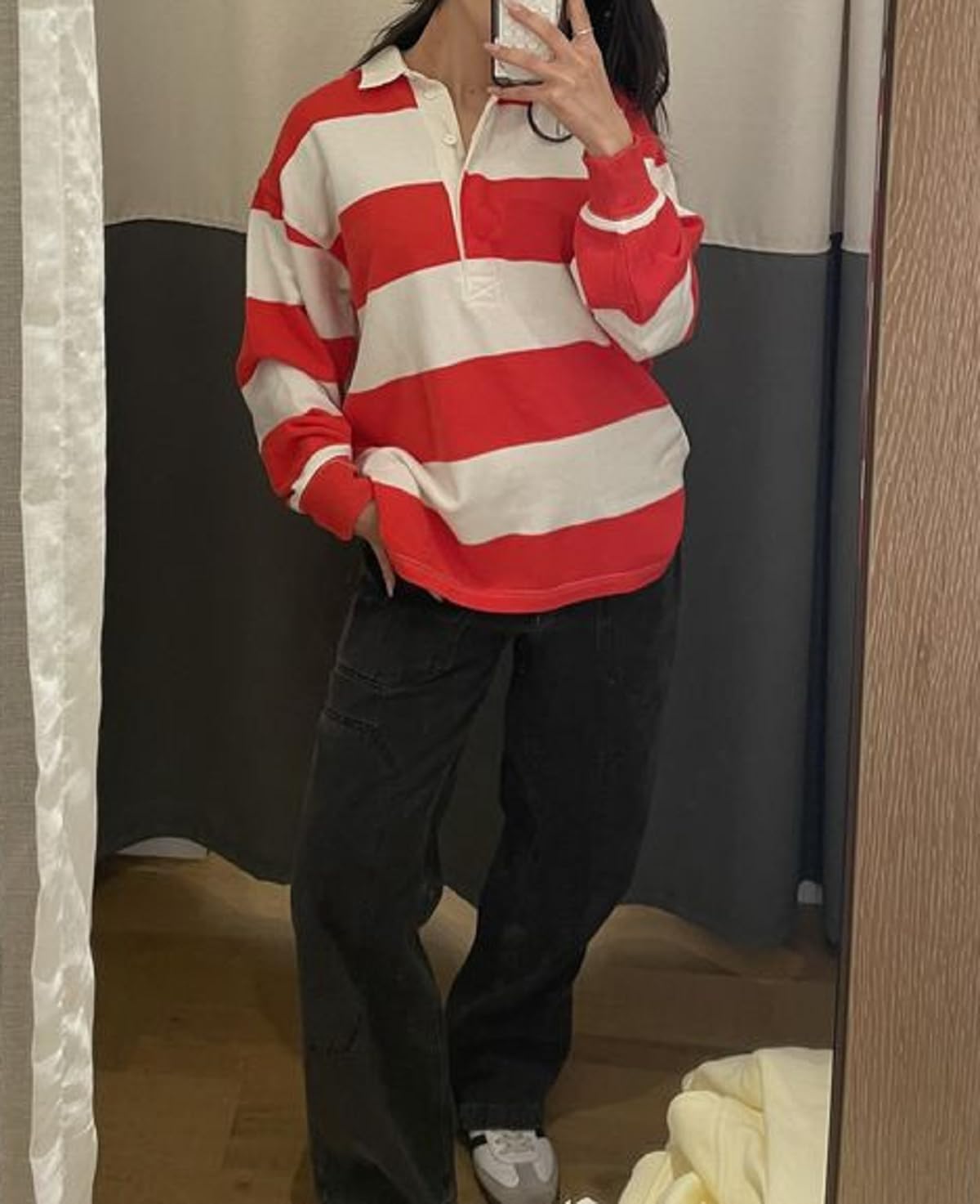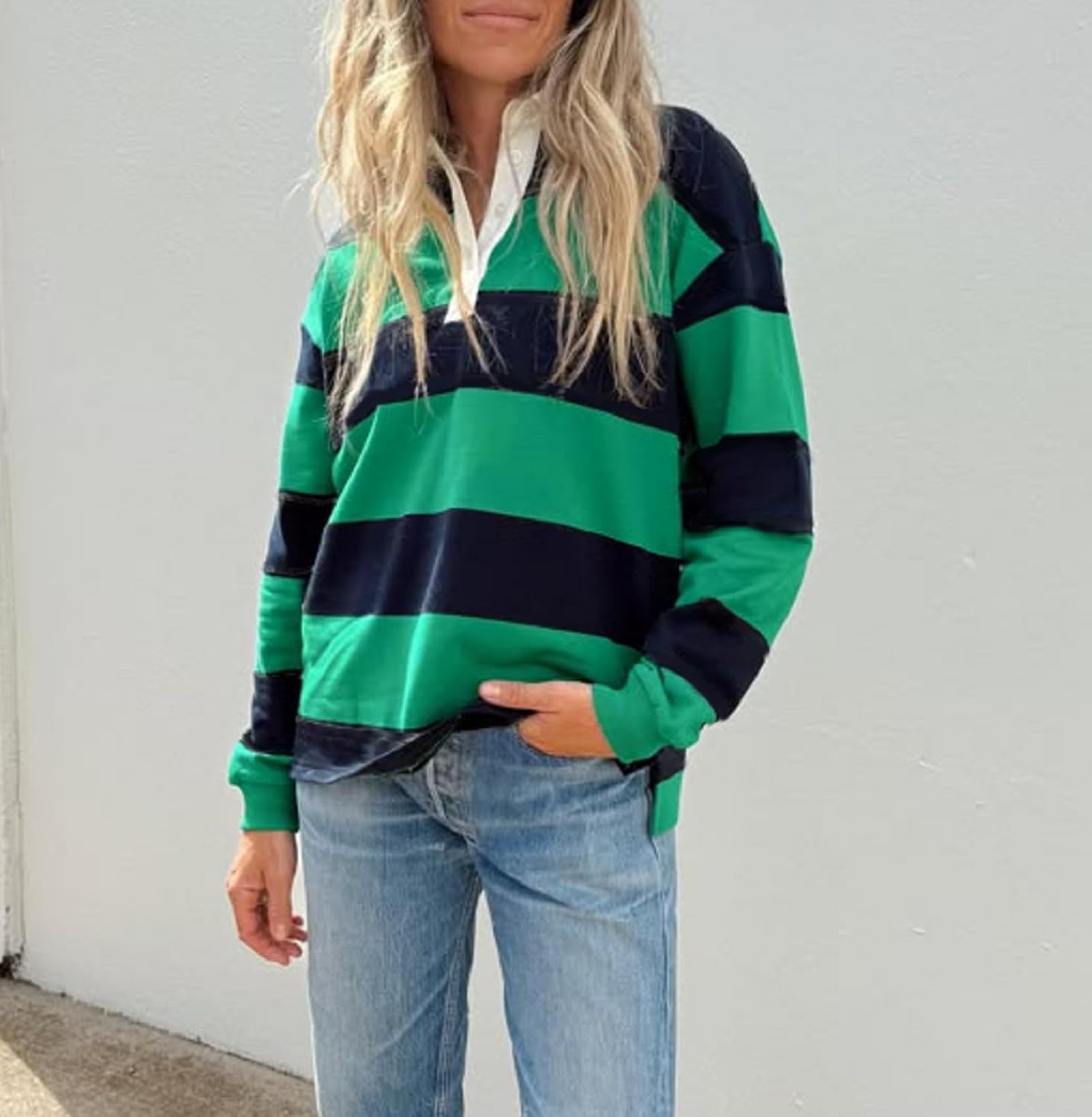 Features: Long sleeve polo shirts for women, womens rugby shirt, rugby shirt features half button-up collared, long sleeve, ribbed trim and contrasting striped pattern design for a chic look