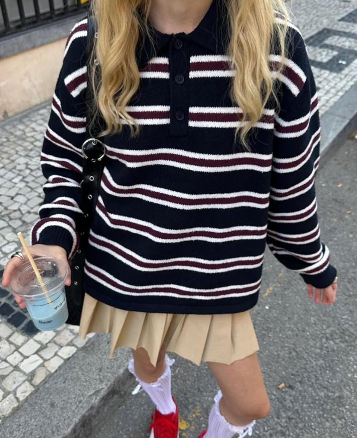 Matching: Polo v neck striped sweater women with a casual style for easy to match with straight leg pants, wide leg pants, flare pants, jeans, long skirts, denim skirts, pleated skirts, etc