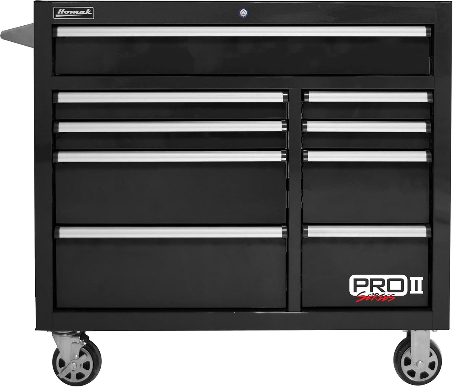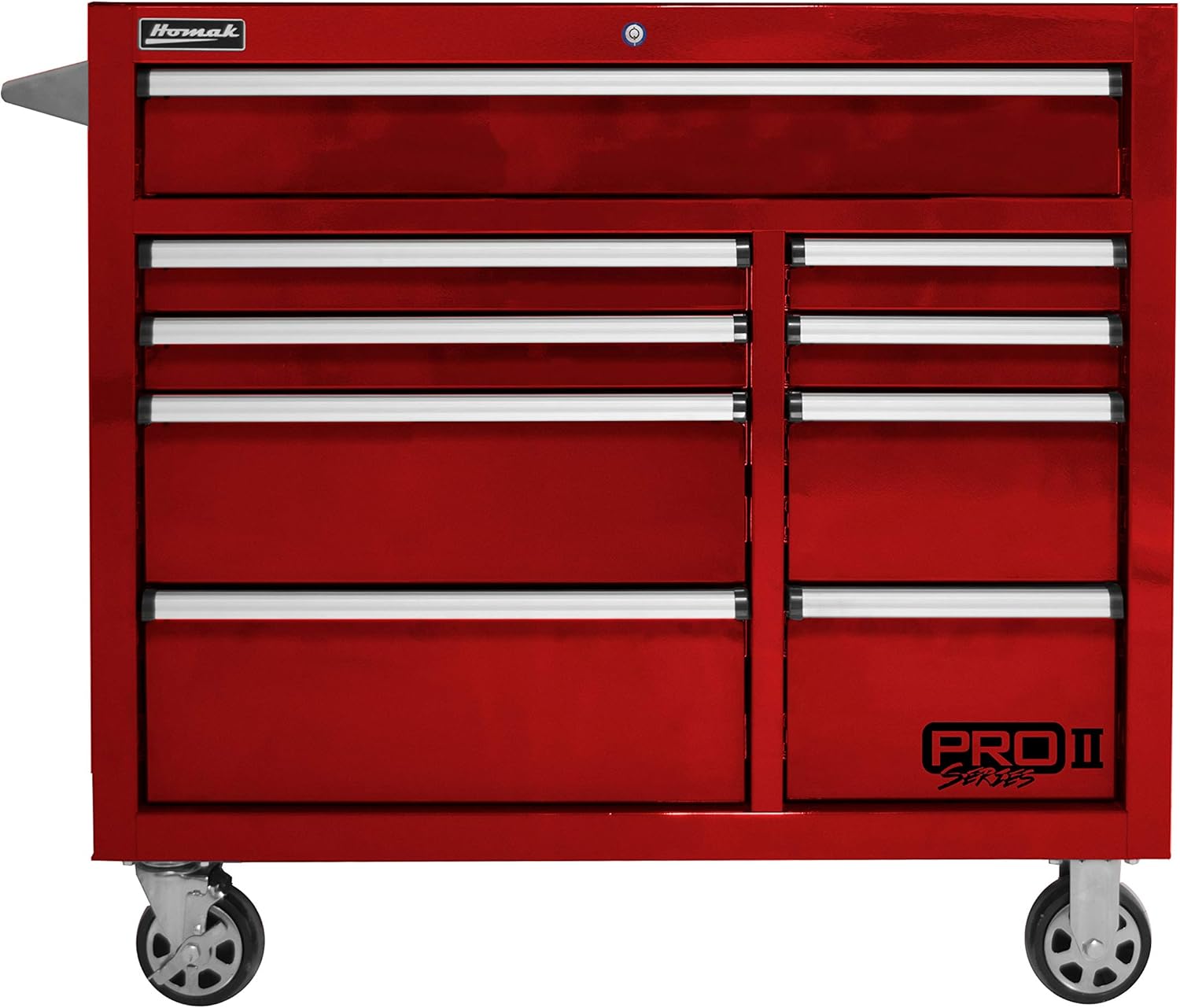Product Description The Homak PRO II Series has top of the line features. It has an extended depth of 24.5" so you can fit your larger tools in your toolbox rather than having to set them next to it. The top chest is equipped with two electrical openings so you no longer have to fight to get it open or closed while your hands are full of tools. All drawers are structurally stiffened. Each drawer has EVA drawer liners. From the Manufacturer Homak Manufacturing was founded in 1947 in Chicago by Sigmund H. Danziger. The name "Homak" was coined after a sign that Sigmund saw on a hat store. Originally a manufacturer of steel kitchen cabinets, Homak Expanded its product offerings in the 1960s to included a separate line of hardware products such as toolboxes, tool cabinets, and other accessories. Homak's hardware line remained strong and was accepted in many major retail businesses of its time. Following Sigmund's death in 1979, his wife, Gertrude, ran the company for 25 years. Under Gertrude's guidance, Homak extended its product line with automotive, hospital, and sporting goods. In January of 2005 Homak was acquired by JVA and moved its office to western Pennsylvania. Its facility now resides in the Wampum Underground Commerce Center. Today, Homak emphasizes tool storage and gun cabinet security. The full product line consists of hand-carry toolboxes, tool bags, parts organizers, tool storage cabinets, workbenches, garage furniture, safety cabinets, spill containment systems, P.B & E. products, steel lockers, gun cabinets, fire-resistant safes, ammo storage boxes and accessories. Each item is manufactured to exceed customer's expectations, and to provide strength and dependability to the customer.