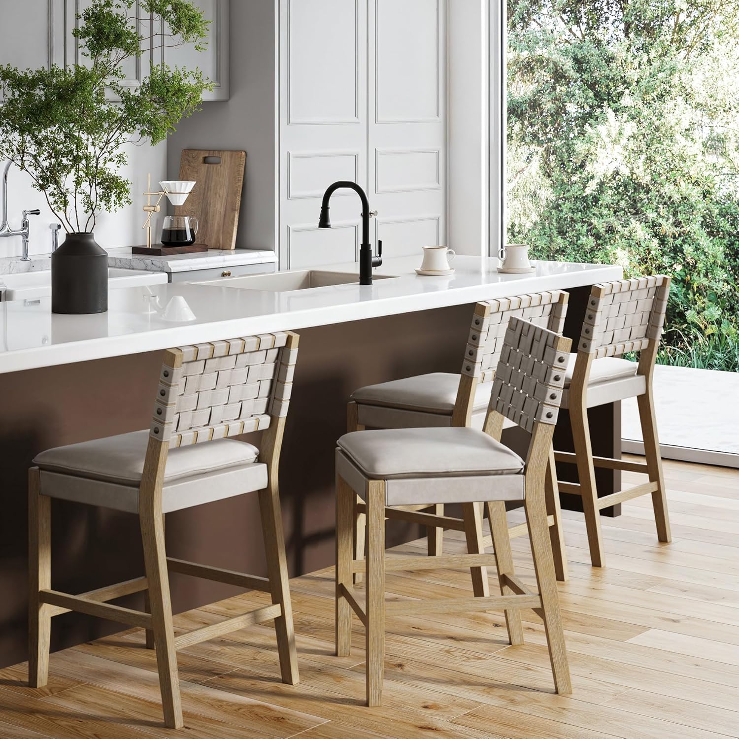 Meet Cohen, an upholstered leather barstool to add to your mid-century modern kitchen. The legs of this counter height stool are made from solid rubberwood with hard-wearing painted finish in natural brown color. Complementing the beautiful frame is a cushioned saddle shaped seat upholstered in brown faux leather for your ultimate comfort. The seat has soft rounded edges for that cozy pillow look and feel. The Cohen counter stool also features a stylish woven back rest with luxurious stud details on both sides, making it a perfect accent piece in your bar area! Nathan James is the furniture company built for this generation. You don't need to spend a fortune to get quality design-first furniture, and when we say easy assembly, we mean it. Our guarantee is our word. Your purchase is backed by a 100% money-back guarantee. If you have any quality issues, contact us, and we will send you a replacement immediately—no questions asked. This product is not recommended for commercial use. Materials: - Painted Rubberwood - Foam Cushion - Natural Brown PU Leather Assembly Must-Haves: - Packaging carton as working surface - Philips screwdriver Weight Limit: - 300 lbs
