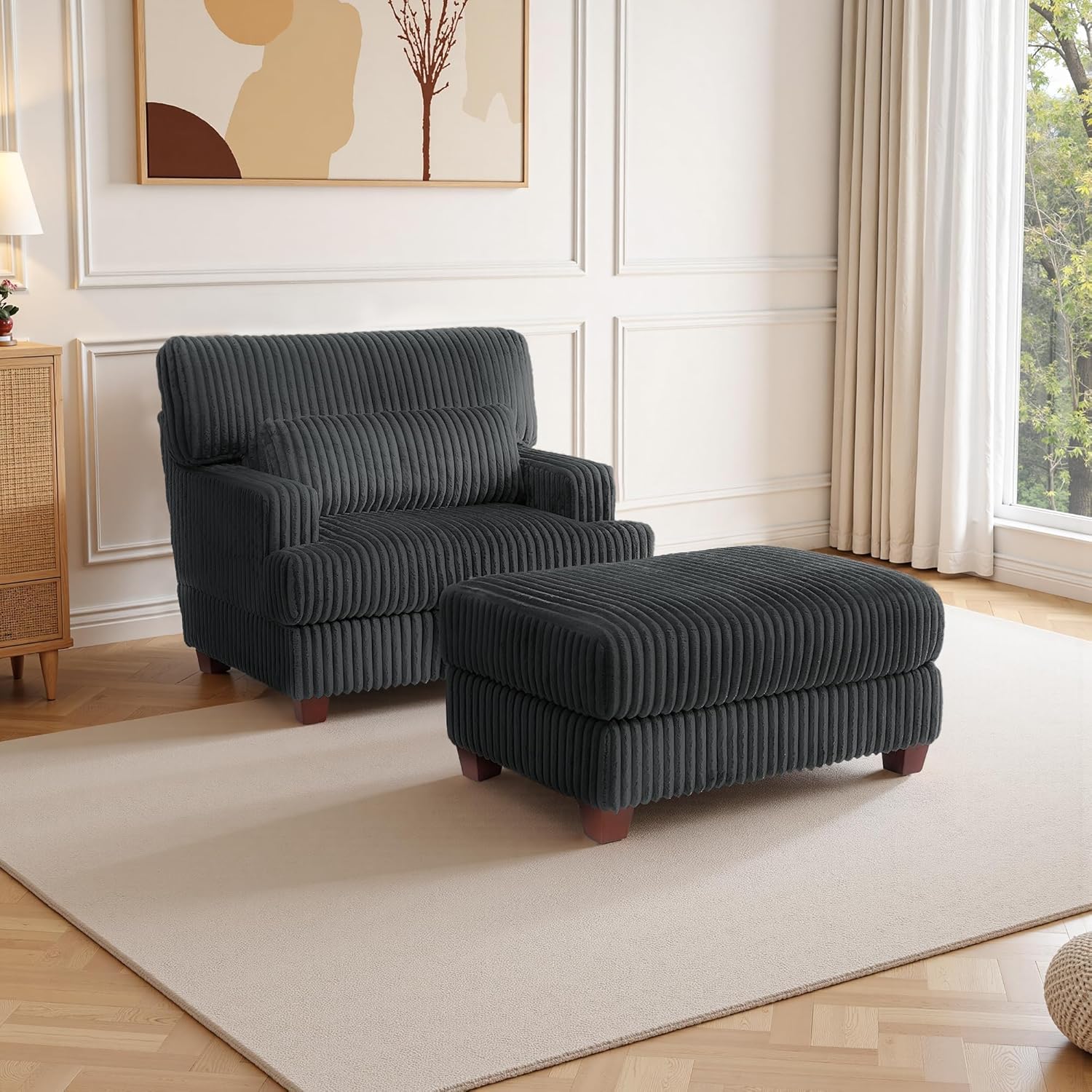 Oversized Chaise Lounge Chair Indoor with Cup Holder & Storage Ottoman, Solid Wood Frame Sofa Couch Chair for Living Room, Bedroom, Office, Dark Grey