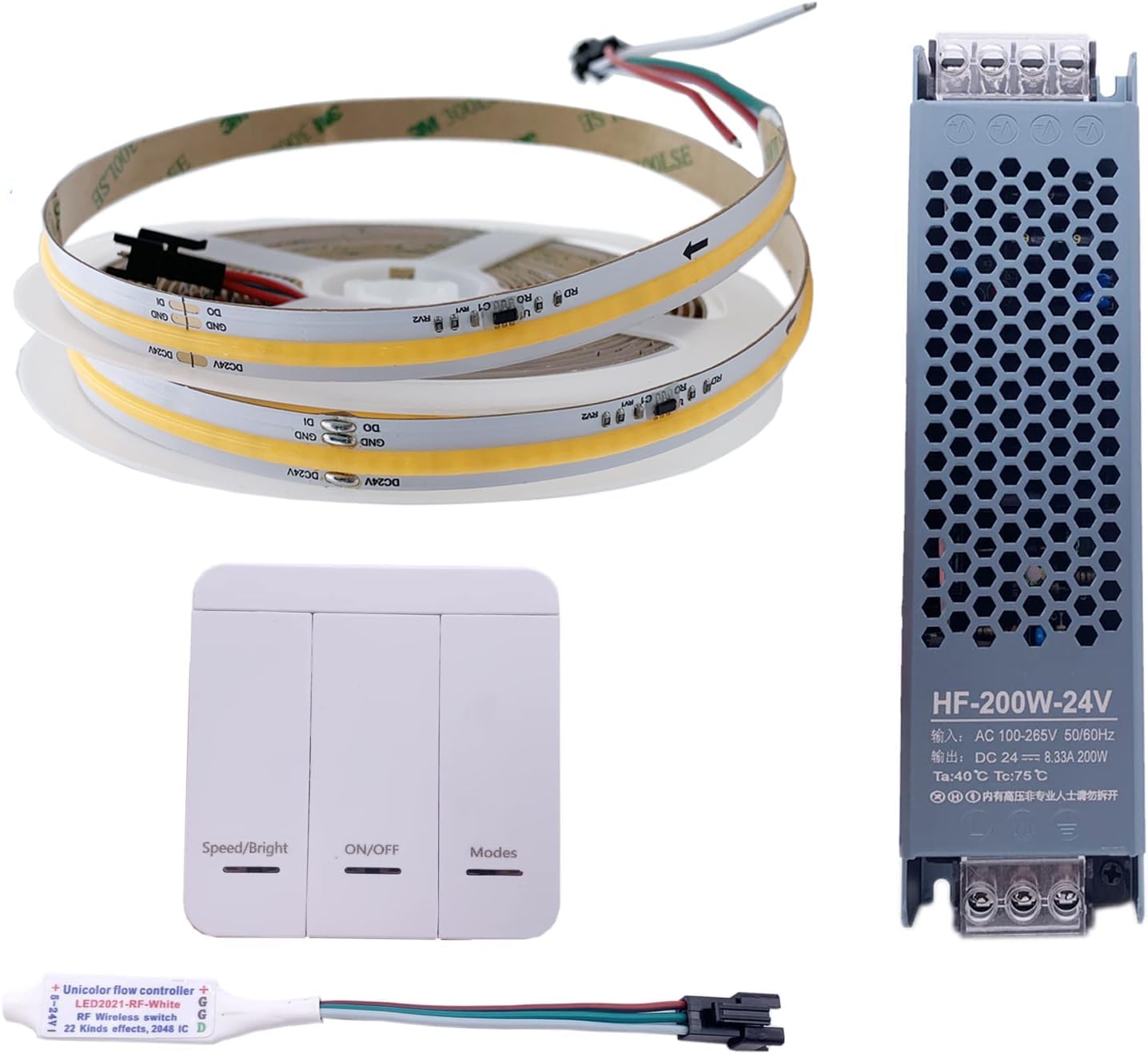 Product Name: WS2811 IC COB Horse Race Led Strip LED Type: COB LED Diodes LED Qty: 360LEDs/M PCB width:10mm Max Power: 10-12W/M Working Voltage: DC 24V Color: Cool White / Warm White / Natural White Color Temperature: Cool White 6000K / Warm White 3000K / Natural White 4000K IP Rate: IP20 Non-waterproof Connector: 3 Pin Male & Female Connector IC Qty:12pcs IC per meters, 60pcs IC for 5M Package: 5M/Roll *** Horse Race Led Strip Controller: Mini LED strip controller with 3 Keys panel wireless remote control. Working Voltage: DC 12V 24V Remote Distance: 15M in the open air Powered by 1pc*CR2025 Battery (Battery are not included) Max control 2048 Pixels(IC), Pixels Points adjustable ( If you found some led strip not light ON,please do IC Setting,increase the Pixels points). Speed/Brightness is adjustable With Double-side tape on the back,easy to install at anywhere Modes Effects: Touch Panel Controller with 11/20 kinds of different modes changable. DC 24V Power Supply: Input Voltage: 110V / 220V AC Output Votage: 24V DC Output Power: 200W Features: No Noise, Real power output, long life-span. * Advise: 24V 100W power supply used for 5M, 1pc 24V 200W power supply to drive max 20m 24v 360leds/m COB running water light strips. If you want to control longer horse race led strip for a project,just buy addtional 24V power supply from our store,there is a wiring diagram in the bottom of this page. When the led strip is over 10m,please kindly connect power wire to the two ends of led strip, to keep the same brightness. There is wiring diagram in the following of this page.